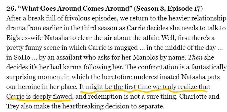 IMO Carrie is deeply flawed, it was established in the first season, then chiseled in stone when she was late as the MOH to a large expensive wedding that been one of Charolette’s dreams/motivation s and maybe q