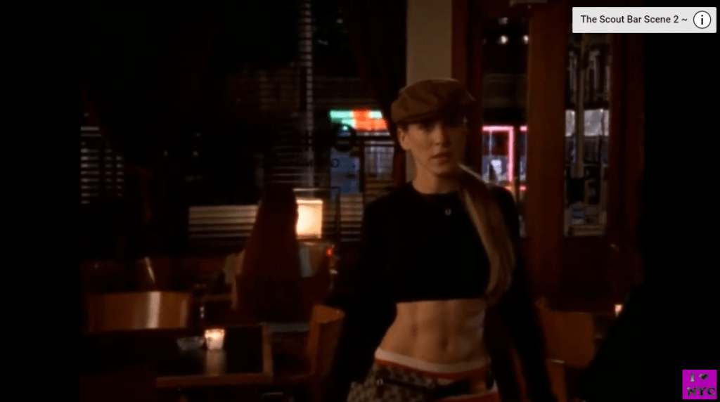#6 – Anyway, Carrie decides to go down to Steve’s bar to interrupt guys night to tell Aidan thank you for taking care if Miranda. She shows up in this outfit and HELLO AB GOALS. (I mean, when I was running half marathons I didn’t even come close to 1/10th of this but a girl can dream)