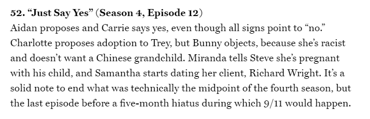 I didn’t realize this, but this was the last episode that aired before 9/11. Also, Vulture agrees with me that Carrie should have said no.