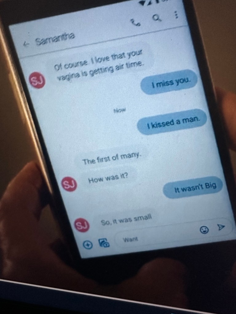 Samantha responds that it will be the first of many and asks how it was. I really hate this whole thing with Carrie trying to reconcile with Samantha because we all know she’s never going to show up due to the IRL tension between SJP and Kim Cattrall. Anyway, Carrie asks if she wants to talk, and Samantha responds, “Soon.” This is so dumb.