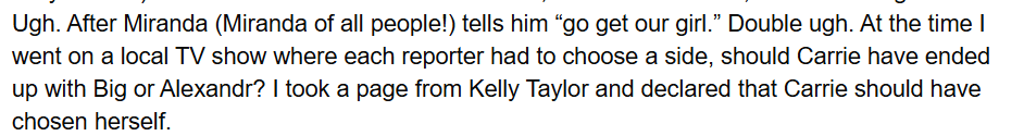 So what is my entire point? I’ve been rewatching The Mindy Project and forgot that Chris Messina kind of disappeared during Season 4. Wanting to sus out the sitch, I turned to the Googles and fell down a rabbit hole in to a series called It Still Stings from Paste Magazine. One of their features is about how Carrie deserved better than Big.